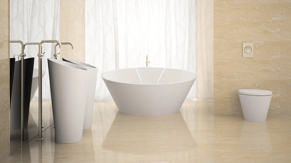 Najczęściej spotykamy się ze spiekami w łazienkach. To pomieszczenie od dziesiątek lat wykańczane jest płytkami, a od niedawna także odporniejszymi spiekami kwarcowymi. Na ścianach łazienki te wielkie płyty mogą tworzyć piękne kompozycje. Najmodniejsze obecnie rozwiązanie, które doskonale wpisuje się we wnętrza w stylu glamour, to połączenie płyt w kontrastowych kolorach. W łazience warto zastosować takie rozwiązanie na największej płaszczyźnie lub na ścianie naprzeciwko drzwi.