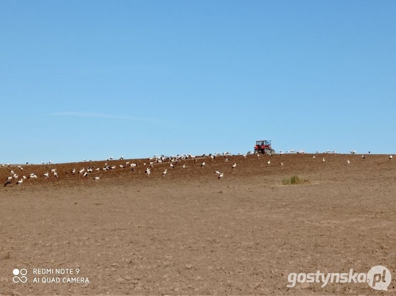 Setki bocianów, a pośród nich samotny traktorzysta