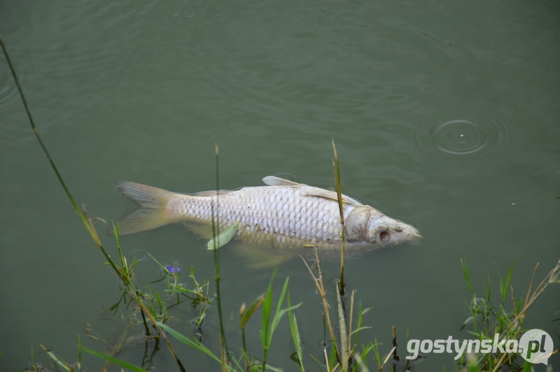 W pobliżu stawu czuć smród. A obok stoi beczka wypełniona martwymi rybami