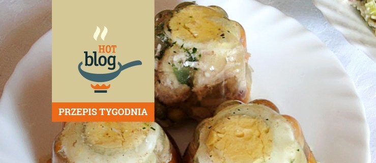 Składniki: 4 nogi kurczaka, 2 pęczki włoszczyzny, pół selera, pęczek lubczyku, 6 jajek ugotowanych na twardo, pół puszki zielonego groszku, sól, pieprz, 6 łyżeczek żelatyny, ziele angielskie, liść laurowy, pęczek natki pietruszki