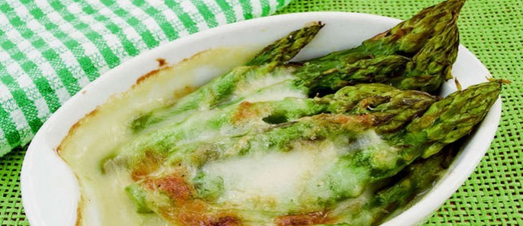 Propozycja na obiad i kolację. Przepis na szparagi zapiekane w sosie beszamelowym, posypane żółtym serem jest dostępny na HOTBLOG-u.
