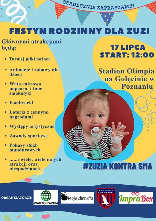 Dokładnie 1 lipca 2021 roku na portalu siepomaga.pl. ruszyła zbiórka pieniędzy na leczenie Zuzi Suleckiej ze Smogorzewa chorującej na SMA - rdzeniowy zanik mięśni. Przez ten czas w walkę o zdrowie 2-letniej mieszkanki powiatu gostyńskiego zaangażowały się tysiące ludzi. Dzięki wspólnemu wysiłkowi jest szansa, że już w ten weekend (2-3 lipca 2022r.) kwota na zakup najdroższego leku świata dla Zuzi osiągnie 8 mln złotych.
