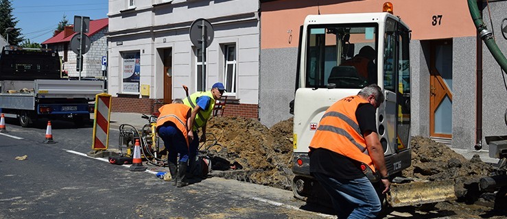 Przy skrzyżowaniu z ul. Folwarczną rozkopy, zarówno na drodze, jak i chodniku. Pracują tam maszyny ZWiK w Gostyniu, widać też pracowników Zakładu i ekipę pogotowia wodociągowego.