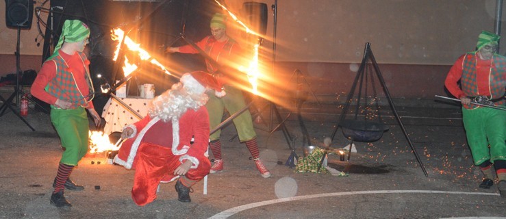 Druga część imprezy odbywała się na świeżym powietrzu. Podczas widowiska świetlnego z udziałem ognia okazało się, że Mikołaj znalazł się w opałach. Ale trochę na własne życzenie, bo święty to on nie jest. Bekał ogniem, pił wodę ognistą, bawił się zapałkami, w końcu zaatakowały go trolle. Z opałów Mikołaj, na szczęście, wyszedł cało. Było ogniście, świetliście i wybuchowo, a oglądający przedstawienie wynieśli mnóstwo pozytywnej energii.