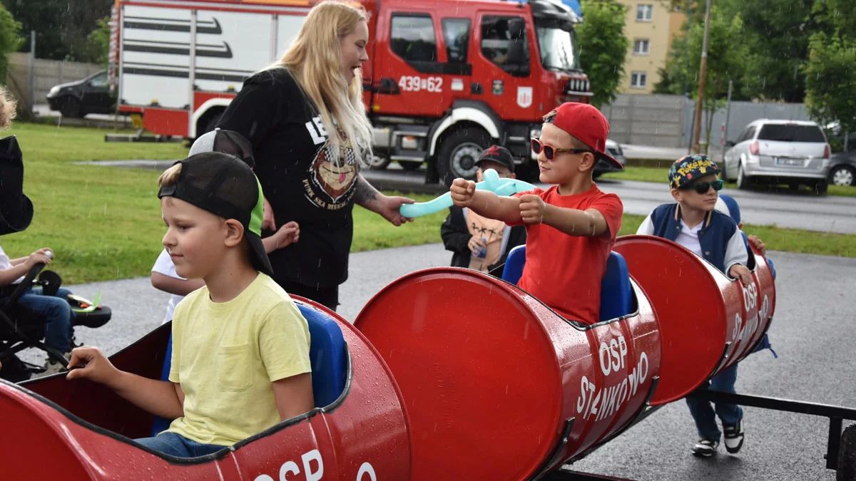 Ta część imprezy zakończyła się bardzo miło - mama i tata otrzymali upominki od swoich pociech. Kiedy tylko ze sceny zeszły przedszkolaki, na plac wjechał pociąg OSP Stankowo, z wagonikami, by zabrać na wycieczkę oczekujących „pasażerów"