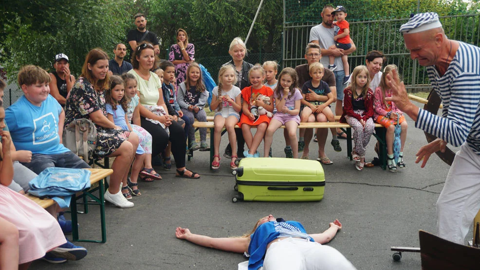 Najpierw wystąpił Teatr Łata z "Morskimi Opowieściami". Prowizoryczne morze, bezludna wyspa i dwoje aktorów porozumiewających się gestami i okrzykami. Dzieci świetnie odbierały marynistyczną opowieść o przyjaźni, żywiołowo reagując na wyrazistą grę aktorską dwójki rozbitków i groźnego Neptuna. Był śmiech, interakcja, emocje. Rodzice i opiekunowie też zapatrzyli się na sztukę, zapominając przez chwilę o powściągliwości. Komiczna walka o nadbagaż na skleconej łajbie rozśmieszyła nawet tych najpoważniejszych. Natomiast zapasy rozbitka z ośmiornicą były głośno sekundowane przez rozbawione dzieci.