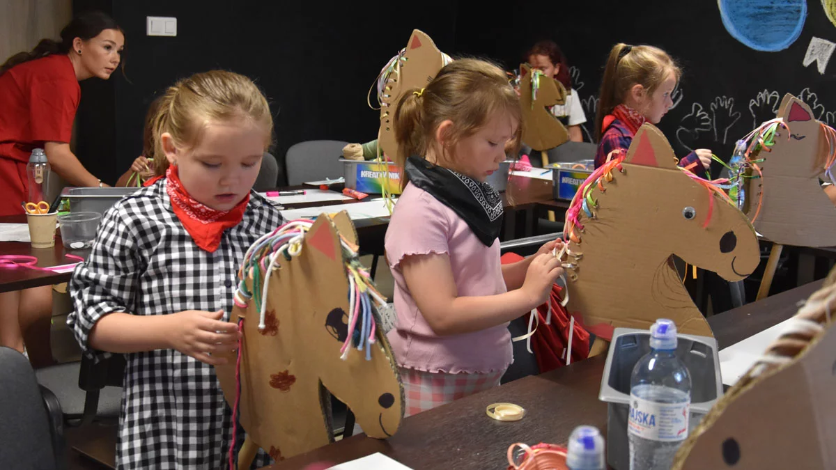 W salce, gdzie odbyły się zajęcia, na uczestników czekali ulubieni i najbardziej znani bohaterowie westernów, czyli kowboje - w takich strojach zaprezentowali się instruktorzy - dyrektor MGOK-u oraz Karolina Piórek, prowadząca zajęcia. To oni zadbali o to, by głowy koni, wycięte z kartonu, oddać w ręce dzieciom. Dodatkowo przygotowane były kolorowe tasiemki, wstążki, sznurki. Wykorzystując te materiały, uczestniczący w warsztatach ozdabiali głowy koni w gęste grzywy.