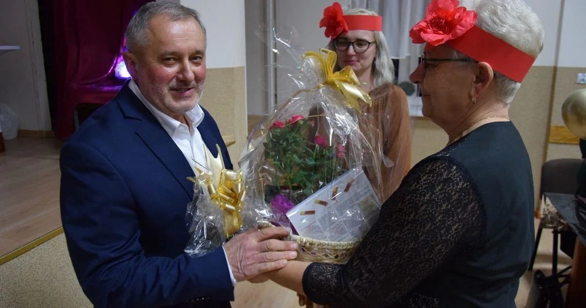 Oczywiście Dzień Kobiet w Chwałkowie nie mógł się obyć bez kwiatów, które paniom w stylizacjach z czerwonymi opaskami i kwiatami we włosach, wręczył sołtys Jan Mikołajczak.