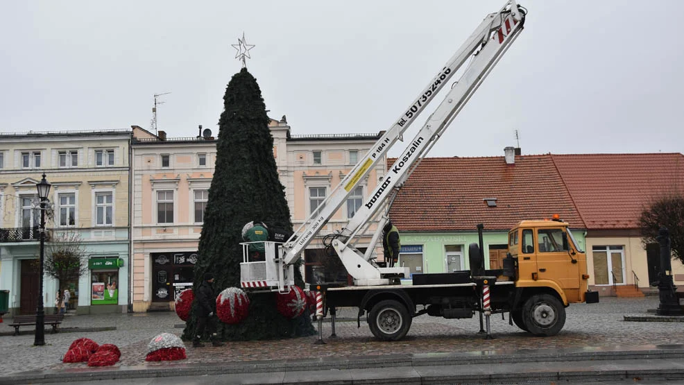 Najokazalszą atrakcją świetlną na rynku jest 10-metrowa choinka, ustawiona w centralnej części placu. Zawieszono na niej okazałe bombki i lampki, które czekają na rozświetlenie.