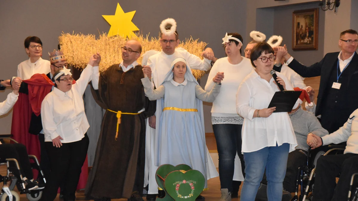 Osoby z niepełnosprawnością, uczestniczące w zajęciach, jakie oferuje Środowiskowy Dom Samopomocy w Gostyniu, a także ich rodzice lub inni opiekunowie spotkali się 21 grudnia 2022r., w Powozowni w Gostyniu. Dołączyli instruktorzy i terapeuci z ŚDS, a także osoby wcześniej związane z placówką. Dużej wielkości sala wystarczyła organizatorom, nie tylko do ugoszczenia zaproszonych przy wspólnym stole, ale także do pokazania jasełek. Role w przedstawieniu odgrywali uczestnicy zajęć ŚDS w Gostyniu, dla nikogo nie zabrakło miejsca w scenariuszu.