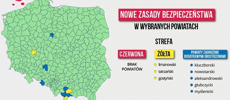 Przypomnijmy - od początku tygodnia w powiecie gostyńskim stwierdzono laboratoryjnie zakażenie koronawirusem u 73 osób. Na skutek tego nasz region, decyzją Ministerstwa Zdrowia, został włączony do tzw. "żółtej strefy", co wiąże się z wprowadzeniem dodatkowych obostrzeń. Oprócz naszego powiatu w żółtej strefie od dziś znajdują się powiaty tatrzański i limanowski położone w Małopolsce.