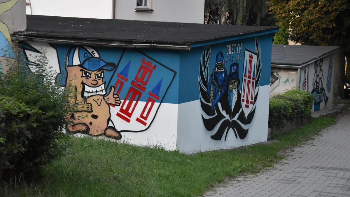 - Taki pomysł w głowie mieliśmy, a miejsce na murale idealne – w pobliżu jest plac zabaw i wykorzystaliśmy to w odpowiedni sposób. Chcieliśmy stworzyć coś innego niż dotychczas - mówią Kibice Lecha Poznań z Gostynia. - Zabiegaliśmy u właścicieli garaży o zgodę na pomalowanie szczytowych ścian, widocznych z placu zabaw. Jeden się nie zgodził, niestety. Ta ściana była już pomalowana, ale nie jest to nasza grafika - tłumaczą reprezentanci gostyńskich kibiców Lecha Poznań.