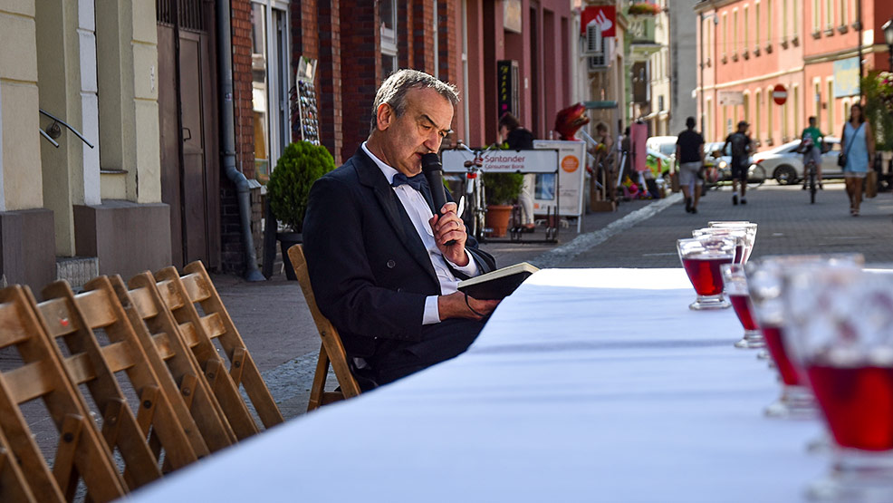 Upalne piątkowe popołudnie na gostyńskim deptaku. Stół, 12 krzeseł, szklanki z czerwonym płynem i on, najpierw poważny mężczyzna we fraku, potem zakapturzony mnich. W tle muzyka i teksty biblijne, a także ks. Józefa Tischnera, papieża Franciszka, kard. Roberta Sarah i inne.