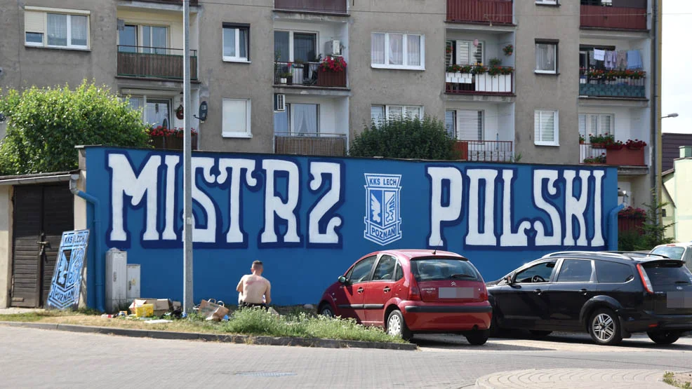 W Gostyniu powstał kolejny mural. Niebiesko-białe malowidło z nazwą słynnego poznańskiego klubu piłkarskiego ozdobiło, brzydko wyglądającą już od lat, ścianę budynku, w którym mieszczą się garaże samochodowe.