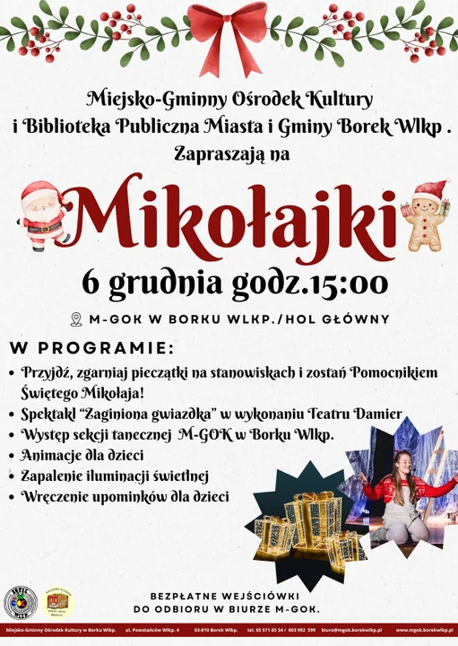 Miejsko - Gminny Ośrodek Kultury w Borku Wlkp. wraz z Biblioteką Publiczną Miasta i Gminy Borek Wlkp. serdecznie zapraszają najmłodszych mieszkańców na MIKOŁAJKI. Spotkanie z mikołajem odbędzie się 6 grudnia o godzinie 15.00, w holu głównym budynku MGOK. Bezpłatne wejściówki można odbierać w biurze Miejsko-Gminnego Ośrodka Kultury w Borku Wielkopolskim. Warto zajrzeć, gdyż na dzieci czeka moc atrakcji:
