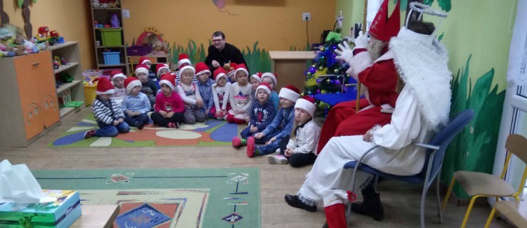 - Opowiedział kim był św. Mikołaj, skąd pochodził, czym się w życiu zajmował - mówi dyrektor punktu Agnieszka Marcinkowska. Jakby proboszcz wywołał „czerwonego wilka z lasu”, gdyż ni z tego nie z owego w „Michałku”, pojawił się w stroju biskupim gminny Mikołaj wraz aniołkiem i podjął rozpoczętą przez Pawła Mintę biografię swojej osoby.