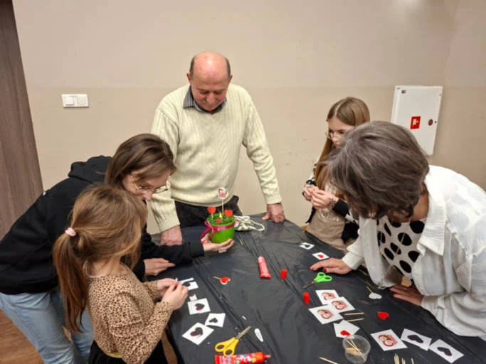 Na posadzone w ziemi cebulki hiacyntów nakładano zielony mech. Zgodnie z nazwą projektu - pojawiły się również papierowe serduszka, także z życzeniami, z których można było wykonać ozdoby dla minigrządki, umieszczonej w doniczce. Świętowanie wspólnie z wnukami było udane i twórcze.