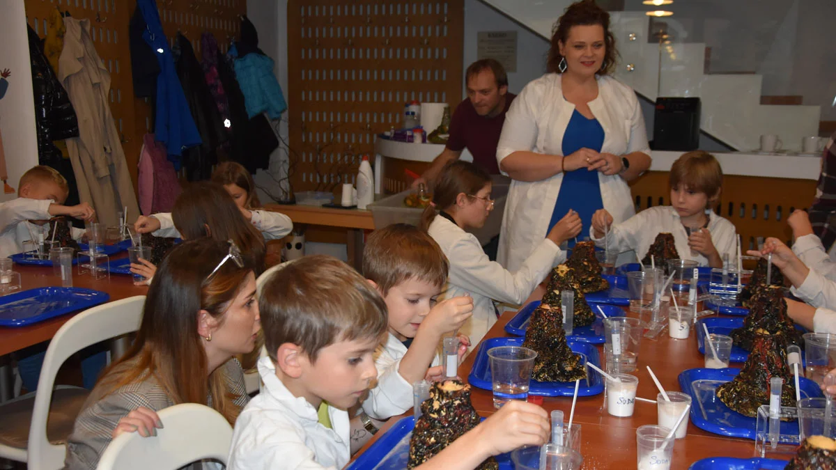 Podczas zajęć, na początku przygotowano pokaz chemiczny. Wówczas wybuchały wulkany w 4 różnych wersjach. Był taki, z którego wydobywał się dym, z innego wydostawały się skały, których w pewnym momencie mnóstwo było w holu. Dzieci zobaczyły też wulkan, który zionął ogniem. I wreszcie pokazano wulkan, z którego wypłynęła gorąca lawa. Niektórzy stwierdzili, że to magia, a prowadzący prostowali: