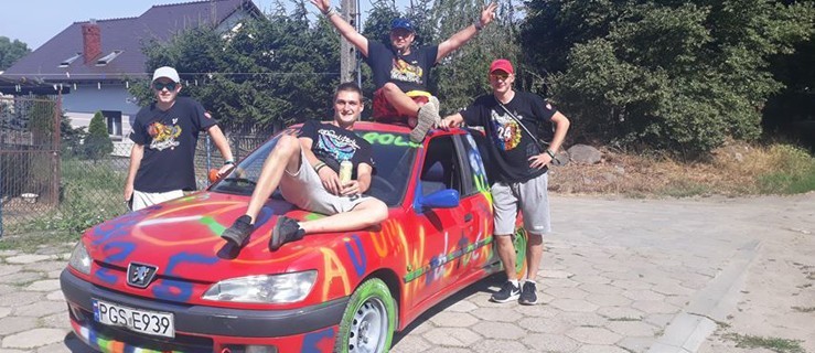 - Auto jest ostatni rok przed złomowaniem. Wpadliśmy na pomysł, aby je pomalować kolorowo i ciekawie. Chcielibyśmy się oryginalnie zaprezentować w Kostrzynie nad Odrą, na jubileuszowej imprezie - powiedział Sebastian Wajchert. Na czerwonym peugeocie pojawiły się kolorowe napisy i malunki: nazwa festiwalu, odciski dłoni uczestników z Kunowa oraz imię właściciela.