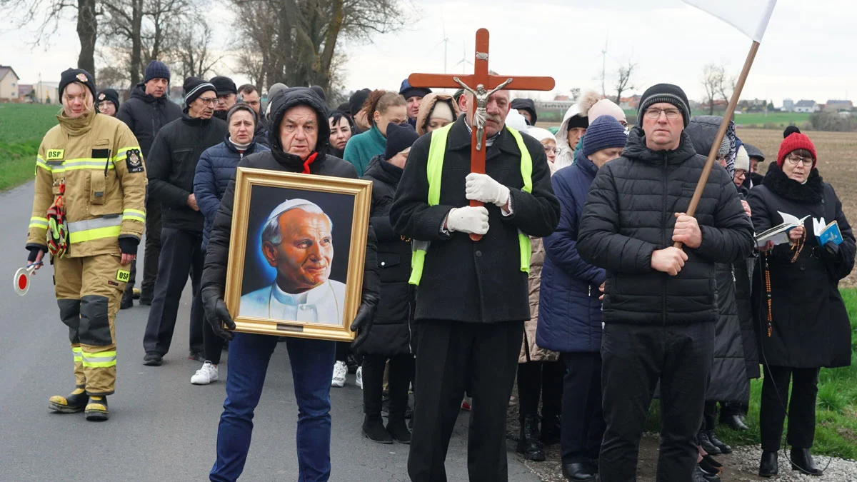 Wraz z wiernymi szedł proboszcz z Domachowa, ks. Paweł Minta. Panowie Marek Wojciechowski, Sławomir Górski i JanNiedziela nieśli krzyż, portret świętego i flagę papieską.