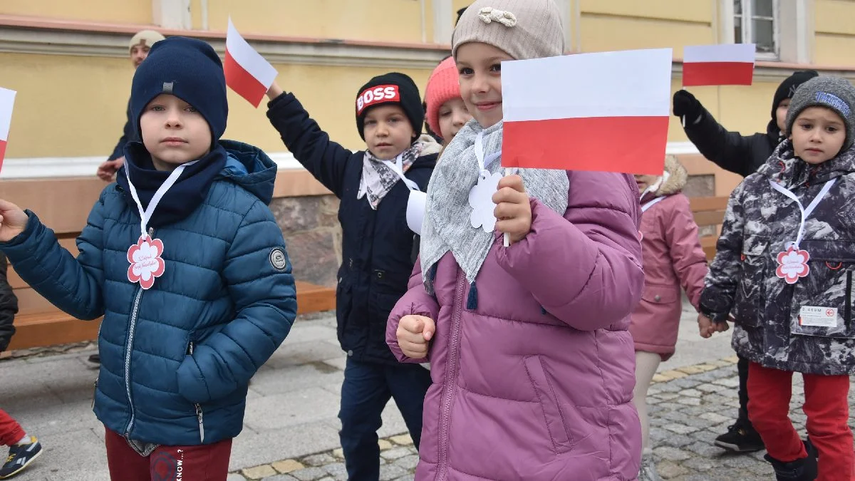 30 z 31![Przemarsz z flagami przedszkolaków z Przedszkola Samorządowego "Pod Świerkami" w Krobi]()