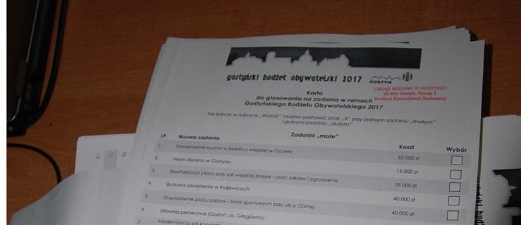 W głosowaniu internetowym i tradycyjnym - w lokalach wyborczych w sumie wzięło udział 4 437 mieszkańców naszej gminy, co stanowi blisko 19% uprawnionych. Zdecydowanie większym zainteresowaniem cieszyło się głosowanie internetowe za pomocą strony www.gbo.gostyn.pl. W ten sposób głos oddało 4 173 mieszkańców gminy. Na osobiste głosowanie w jednym z 26 lokali wyborczych zdecydowało się tylko 264 wyborców. Nie będzie siłowni plenerowej na os. Głogówko w Gostyniu, nie popisali się też mieszkańcy Daleszyna – na projekt związany z budową drogi w wiosce oddano tylko 40 głosów, w Siemowie też w 2017 r. nie powstanie parking. Przynajmniej nie w ramach GBO.