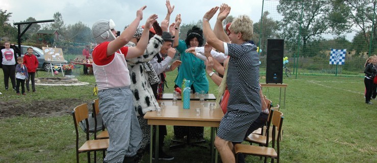 Piknik rozkręcił się na całego, kiedy zaczęły się konkurencje z udziałem dorosłych. W dziwnych okularach  - przekazywanych jak pałeczka w sztafecie - rywalizowali w wyścigach z taczką, w parach wraz z dziećmi „nurkowali” w słomie, w poszukiwaniu ziemniaków. Musieli je  wyłowić z zamkniętymi oczami i wrzucić do kolorowej torby (skorzystali ci, którzy znaleźli najwięcej, bo uczestnicy zabierali wyładowane pyrkami torby do domu). Gospodynie z Bruczkowa mogły popisać się „sprawnością kulinarną”, rywalizując w przenoszeniu na tacy różnych produktów spożywczych. Za to podopieczni DPS w Zimnowodzie w dowcipnej scence  pokazali, jak można świetnie bawić się na rodzinnym przyjęciu u cioci Brygidy – kobiety o zielonych oczach, na których widok wszyscy szaleją.