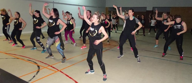 Część druga soboty to maraton zumby, czyli taneczny trening w rytmach latino. Do udziału zostały zaproszone wszystkie panie powyżej 15. roku życia. Zarówno te, które na co dzień uczęszczają na zumbę, jak i te, które dopiero w sobotę poznały jej klimaty. Prowadząca dwugodzinny trening Joanna Kaczor wraz z Agnieszką Krzyżyńska dbały o to, by z prawie pięćdziesięciu uczestniczek wycisnąć wszystkie poty. Uczestniczki poznały nowe kierunki zumby (m. in. zumba strong oraz zumba z elementami kick-boxingu) i układy z salsation, których prowadzące nauczyły się podczas kursów u Alejandro Angulo.