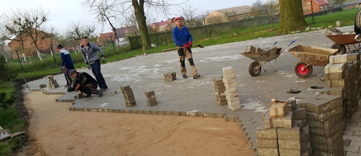 Prace rozpoczęły się w II połowie marca, jeszcze przed Wielkanocą. Muszą zakończyć się do 1 maja – wtedy w świetlicy odbędzie się uroczystość z okazji I Komunii Świętej. – Trzeba było wywieźć ziemię, aby wyrównać plac. Potem przywieźliśmy suchy beton, to należało rozgarnąć. Wykonywaliśmy prace popołudniami. Potem, w którąś sobotę rozgarnialiśmy piasek i później już zaczęło się układanie kostki – wyjaśnia sołtys. Tłumaczy, że do prac przychodziło średnio po 15 osób.