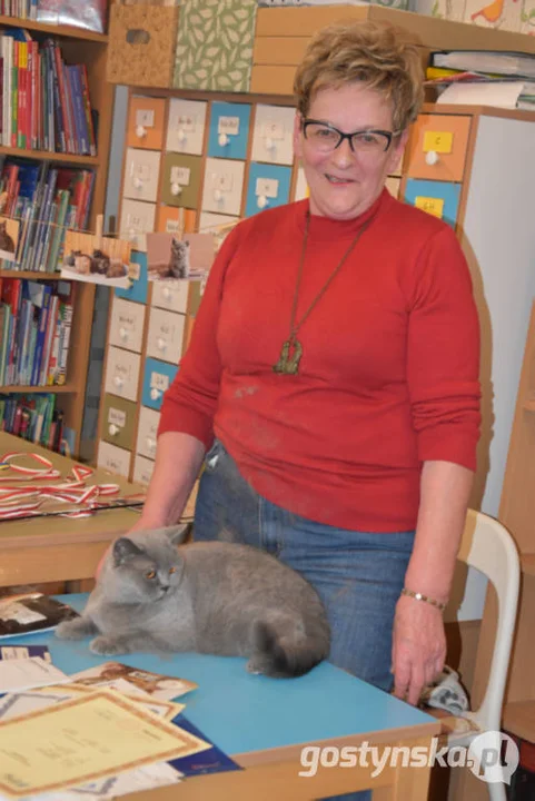 Pani Grażyna do niedawna prowadziłą hodowlę kotów rasowych, dlatego z doświadczenia opowiadała o udziale w w wystawach, o przygotowaniu futrzaków na takie wydarzenie oraz o zasługach swoich podopiecznych, prezentując dyplomy, tytuły i inne trofea przyznane przez oceniających. Mówiła też, jak należy opiekować się kotami, udzielając praktyczny rad. Najmłodsi słuchacze, kórzy nie zdawali sobie sprawy, że kot też musi załatwiać swoje potrzeby (a znaleźli się i tacy) dowiedzieli się np. do czego służy kuweta i dlaczego należy w niej sprzątać. Pani Grażyna uważa, że koty są bardzo dobrymi terapeutami - są doskonałym lekarstwem na stres, dostarczają sporo radosci. Dzieci należy oswajać ze zwierzętami od najmłodszych lat , żeby nauczyły się zasad świadomej i odpowiedzialnej opieki. Potwierdziła, że potrafią wyczuć chore miejsce u człowieka.