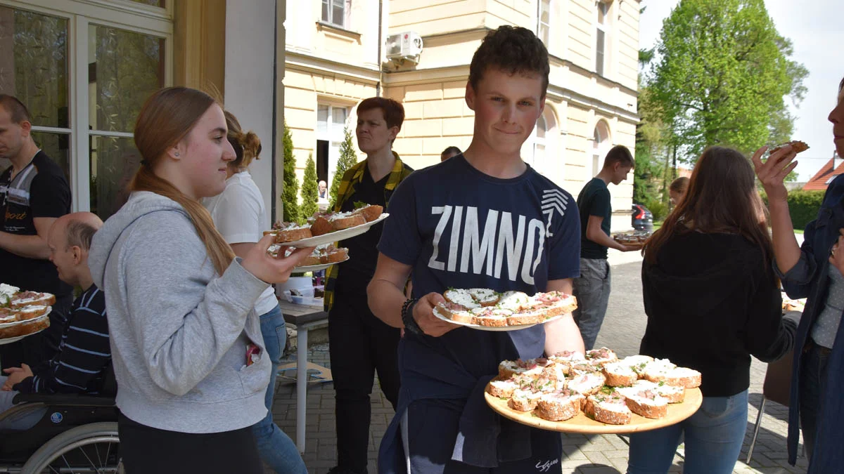 Uczniowie do pasty kanapkowej dodali zioła, ktore zbierali na miejscu - w ogrodzie otaczającym dom pomocy społecznej. Kiedy przyszedł czas, częstowali gospodarzy i pozostałych gości.