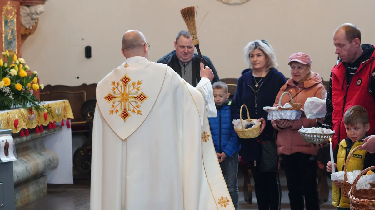 Ksiądz Marek Dudek, superior Kongregacji Oratorium św. F. Neri w Gostyniu odprawił po ukraińsku krótką modlitwę i życzył zgromadzonym wiernym spokojnych i zdrowych świąt Zmartwychwstania Pańskiego. Następnie z rozmachem pokropił nie tylko koszyczki z tradycyjnymi smakołykami, ale i wiernych, na ich wyraźną prośbę. Po uroczystości całe rodziny pozowały u stóp ołtarza z koszykami, jak wyjaśnili, to taka ich tradycja.