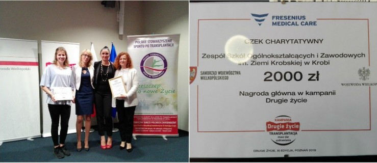 Zdobyciem głównej nagrody zakończył się udział uczniów i ich opiekunów z Zespołu Szkół Ogólnokształcących i Zawodowych w Krobi w kampanii „Drugie życie - transplantacja. Masz dar uzdrawiania”. Projekt był realizowany od października 2018 roku, gdy w Poznaniu nastąpiła inauguracja akcji.