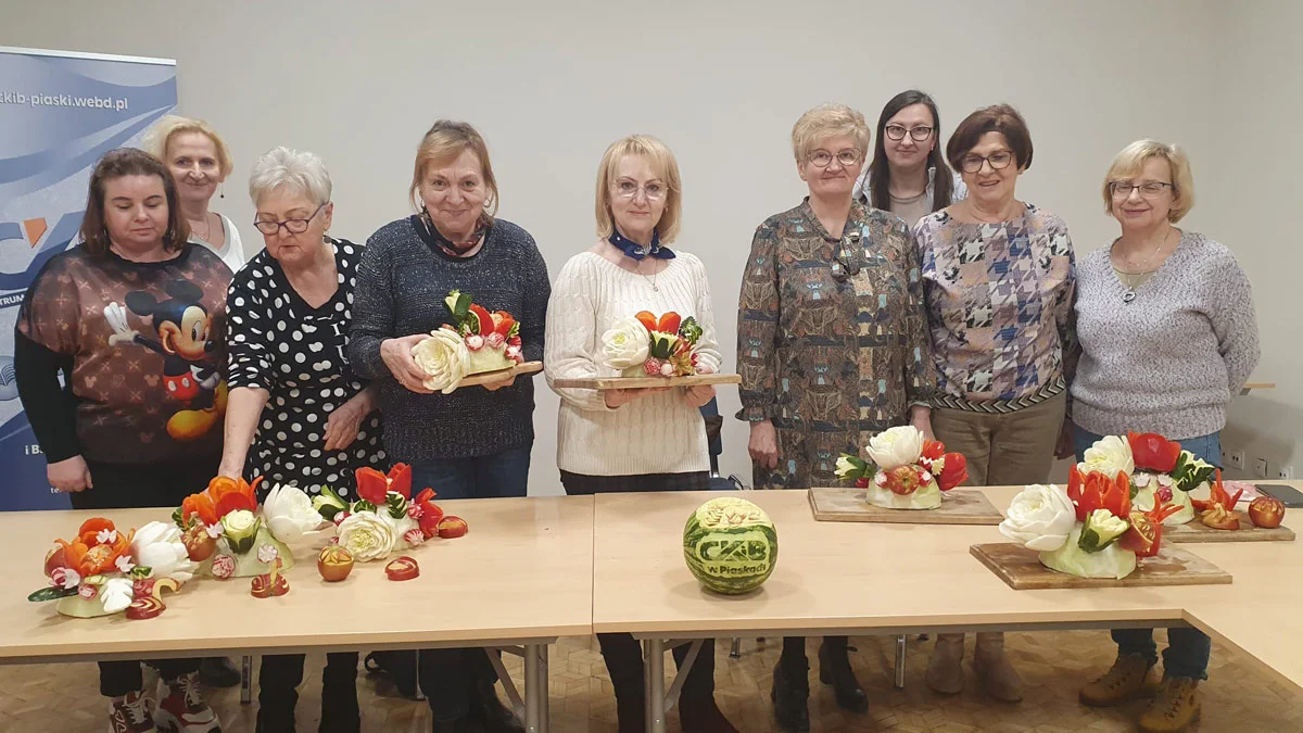 Nie samą sztuką żyje Centrum Kultury i Biblioteki w Piaskach, o czym przekonały się uczestniczki warsztatów carvingowych, które odbyły się w czwartek, 2 marca 2023 r. w jednej z salek wyremontowanego ośrodka. Do dyspozycji pań były piękne warzywa i bardzo ostre noże. Na szczęście obyło się bez głębszych skaleczeń. Oczywiście, same produkty nie wystarczyły, by opanować choć podstawy carvingu. Ktoś jeszcze musiał pokazać technikę i wesprzeć adeptki.