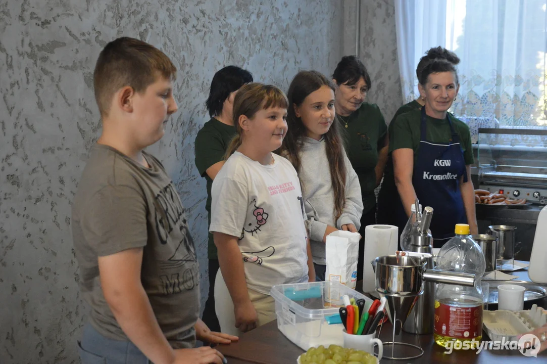 Warsztaty smażenia gofrów w Kromolicach rozpoczęły się od przygotowania ciasta. Każdy krok był wykonywany przez inne dziecko. Jedni wlewali wodę, drudzy dodawali mąkę, a jeszcze inni rozbijali jajka. Nad całością czuwały panie z Koła Gospodyń Wiejskich w Kromolicach. Gdy ciasto było gotowe, dorośli zajęli się wypiekaniem gofrów. W tym czasie młodsi kroili swoje ulubione owoce. Wybór był ogromny: banany, borówki, ananas, winogrono i wiele więcej.