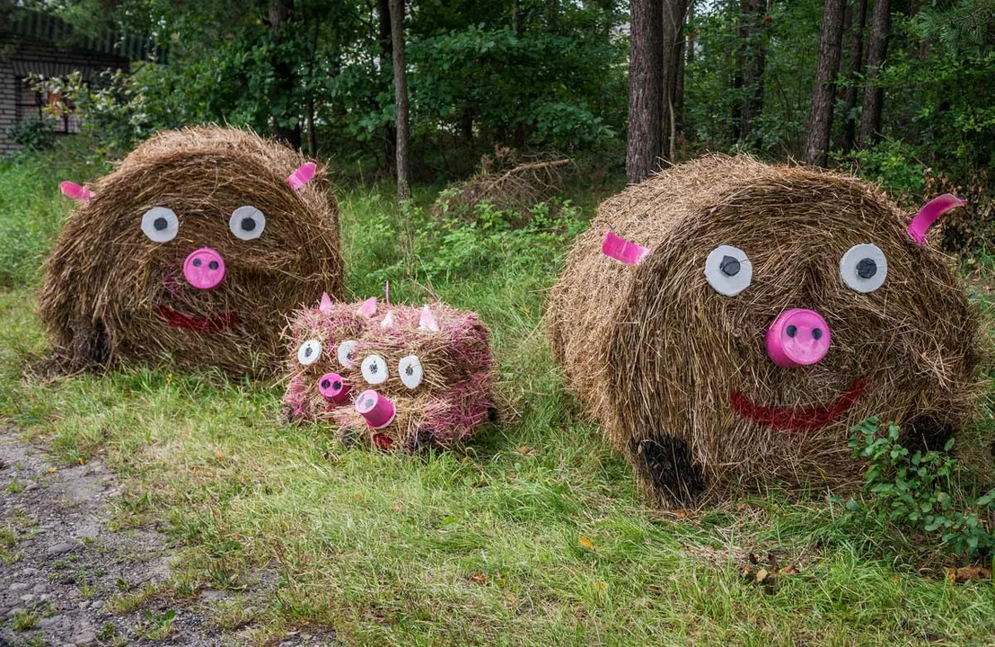 Do przygotowania kukieł dożynkowych w naszym powiecie wykorzystano wiele różnych materiałów, w tym te tradycyjne, jak wiązanki siana, baloty, wiechy kukurydzy, owoce i warzywa ale i papier, tkaniny, a nawet podświetlenia. Przy drogach usytuowano wiejskie baby i chłopów zapraszających do zabawy, pojazdy rolnicze, słomiane świnki, krowy, koguty i konie z wozami czy bohaterów dziecięcych bajek, jak w Ziemlinie [klik]. Wyobraźnia twórców jest nieograniczona.