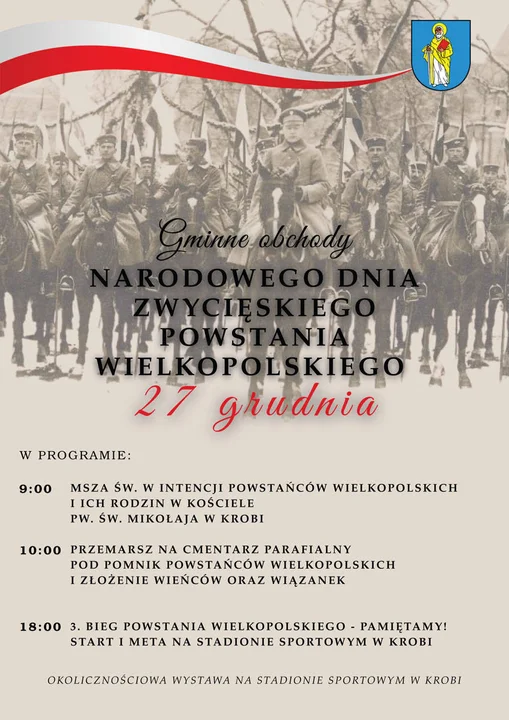 O godz. 9.00 w kościele pw. św. MIkołaja w Krobi odbędzie się msza św. w intencji powstańców i ich rodzin. Następnie uczestnicy przemaszerują na cmentarz parfialny, gdzie pod pomnikiem powstańców wielkopolskich złożą wiązanki kwiatów.Poza tym, w gminie dbędzie się 3. edycja Biegu Powstania Wielkopolskiego - start zaplanowano na godz. 18.00 ze stadionu sportowego w Krobi - SZCZEGÓŁY TUTAJ - KLIKNIJ