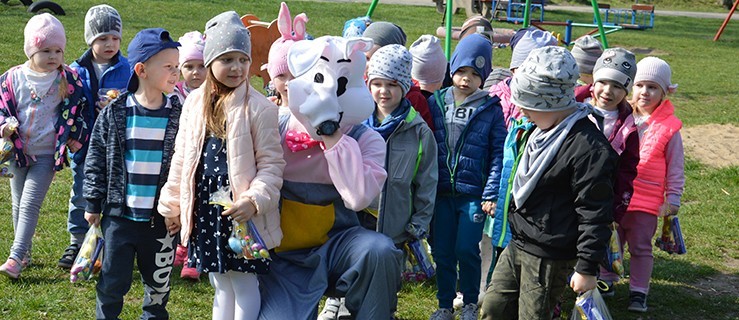 Od rana w sali widowiskowej GOK Hutnik zorganizowano warsztaty, w których główną rolę odgrywały pisanki, farby i kredki. Maluchy miały okazję uruchomić wyobraźnię, ozdabiając kolorowe jajka lub przygotowując „pisankowe” rysunki. Natchnieniem była Pani Zającowa, która chętnie pozowała do zdjęć. Dzieci w ogóle się jej nie bały. Były też tańce, ale i tak dzieci najbardziej podekscytowane były tym, co miało ich spotkać na pobliskim placu zabaw. Po warsztatach uczestnicy wyszli na spacer i dotarli na palc przy ul. Leszczyńskiej, po drodze śpiewając. Przy okazji wypatrywali zająca, który chował się za drzewami. Wielkanocna maskotka przywitała się z maluchami i poinformowała, że na placu zabaw wśród krzewów, zabawek i drzew kryją się prezenty. Dzieci ruszyły na poszukiwania paczek.