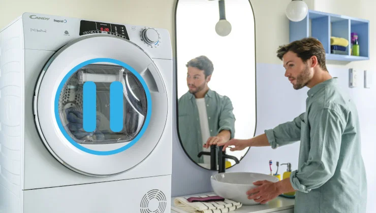 Z Candy RapidO nie trzeba czekać do zakończenia cyklu, aby dołożyć zapomnianą rzecz. W każdej chwili można bezpiecznie zatrzymać suszenie. Wystarczy wcisnąć pauzę i otworzyć bęben, by bez problemu dorzucić zapomniany element garderoby. Nie ma konieczności uruchamiania kolejnego cyku, dzięki czemu zauważalna jest nie tylko oszczędność czasu, ale również pięniedzy. Urządzenie posiada zbiornik Easy Case znajdujący się w drzwiach suszarki. Jego ergonomiczny kształt ułatwia wyjęcie, przenoszenie oraz opróżnianie, zapobiegając rozlewaniu wody. Może pomieścić do 3 litrów wody, którą można później wykorzystać, np. podlewając kwiaty. Nie wymaga opróżniania po każdym cyklu suszenia i jest przezroczysty, dzięki czemu poziom wody jest zawsze widoczny. Co więcej, zastosowana w urządzeniu pompa ciepła skutecznie usuwa wilgoć z wnętrza suszarki. Zamknięty obwód gwarantuje niskie straty ciepła, co znacznie ogranicza zużycie energii. Dzięki funkcji automatycznego dopasowania czasu suszenia do wagi odzieży umieszczonej w bębnie, oszczędzamy prąd, a tym samym środowisko. Urządzenia Candy są szyte na miarę. Sprawdzą się nawet w małych łazienkach. Modele SLIM o głębokości zaledwie 46 cm mieszczą aż 7 kg ubrań. To idealne połączenie kompaktowych rozmiarów i szerokiej gamy funkcji, która sprosta nawet najbardziej wymagającym użytkownikom.