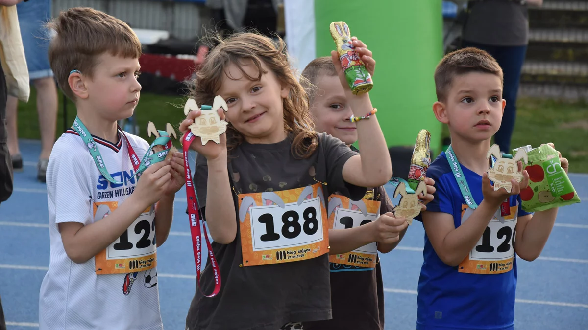 Na mecie na dzieci czekały medale w kształcie zająca oraz czekoladowe słodkości, które powodowały, że na twarzy pojawiał się uśmiech i uzupełniały kalorie, spalone podczas biegania.