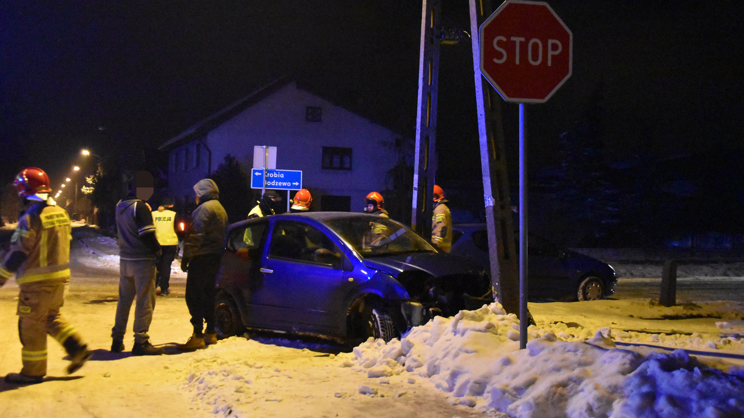 Do zdarzenia doszło dziś przed godz. 22.00, na skrzyżowaniu drogi Rębowo - Ziółkowo z szosą z Krobi w kierunku Bodzewa. Do akcji ratunkowej zadysponowano 2 zastępy JRG Gostyń, patrol policji i pogotowie ratunkowe. Od strony Krobi autem poruszał się młody kierowca. Warunki jazdy nie są łatwe, nawierzchnia jezdni pokryta jest ubitym śniegiem. Jest ślisko.