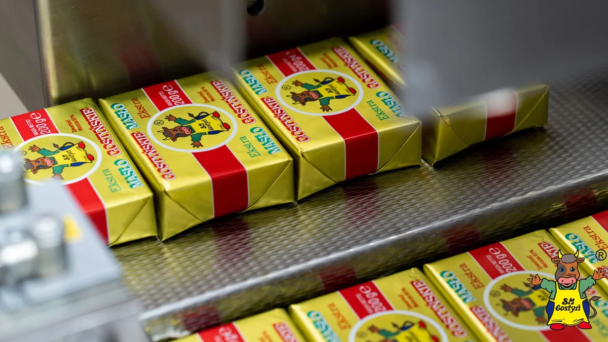 Miesięczna sprzedaż gostyńskiego masła wynosi ok 200 ton. To oznacza, że z taśmy produkcyjnej zjeżdża mniej więcej 1 000 000 kostek masła miesięcznie.