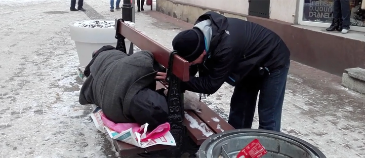 Mroźna aura - dotkliwy wiatr i temperatura około 8 st. C poniżej zera. Na gostyńskim deptaku wczoraj po południu można było zobaczyć mężczyznę, leżącego na jednej z ławek. Wyglądał na bezdomnego, z butelką wina, przykryty gazetą i starą bluzą. Spał, czy był nieprzytomny? A może był nietrzeźwy? Później, kiedy zapadł zmrok, leżał też na ławce przy ul. Witosa, a także przy ul. Helsztyńskiego.