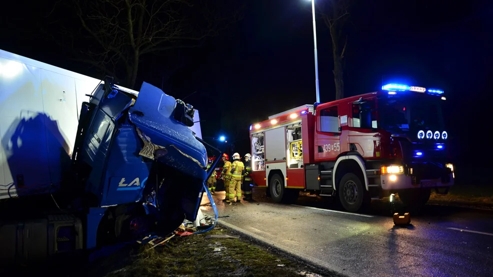 Ciężarówka uderzyła w drzewo na drodze wojewódzkiej w Koszkowie. Kierowca uwięziony w kabinie