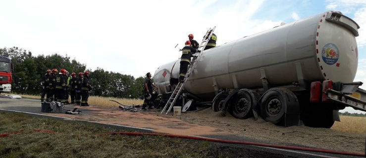 O świcie ciężarówka z wanną wiozącą żwir wpadła na ciężarówkę volvo z cysterną z paliwem. Droga będzie zablokowana jeszcze przez kilka godzin.
