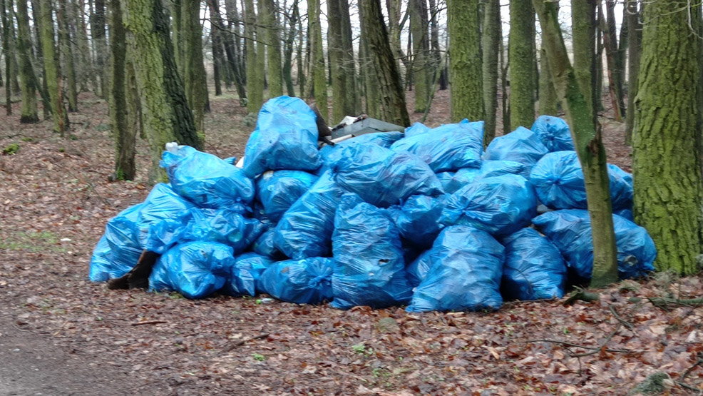 Nie tak dawno otrzymaliśmy informacje od kilku osób o sporej ilości śmieci zgromadzonych w lasku przy drodze powiatowej z Borzęciczek do Pogorzeli. Na załączonych do wiadomości zdjęciach rzeczywiście było widać kilkadziesiąt dużych niebieskich foliowych worków pełnych po brzegi. Zastanawiająca była nie tylko skala, ale i sposób pozostawienia odpadów. Logicznym byłoby, że jeśli ktoś chciałby porzucić śmieci, to zrobiłby to po prostu przy drodze, bez spacerów w głąb lasu.
