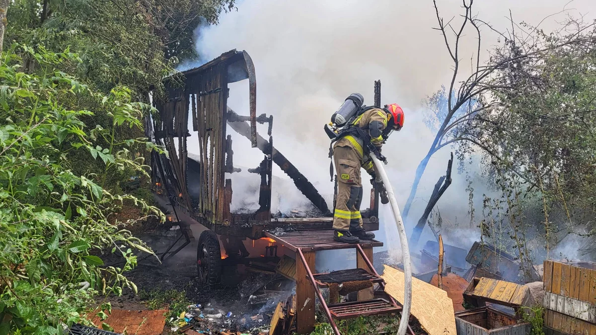 Straż pożarna i policja zostały wcześniej poinformowane. Świadkowie wskazywali, że objęty płomieniami obiekt to drewniana przyczepa. Rozglądając się po zagajniku można było dostrzec także pozostałości drewnianych uli i inne drewniane elementy, dlatego też można przypuszczać, że była to przyczepa pszczelarska, do uli, najprawdopodoniej przeznaczona na złom.