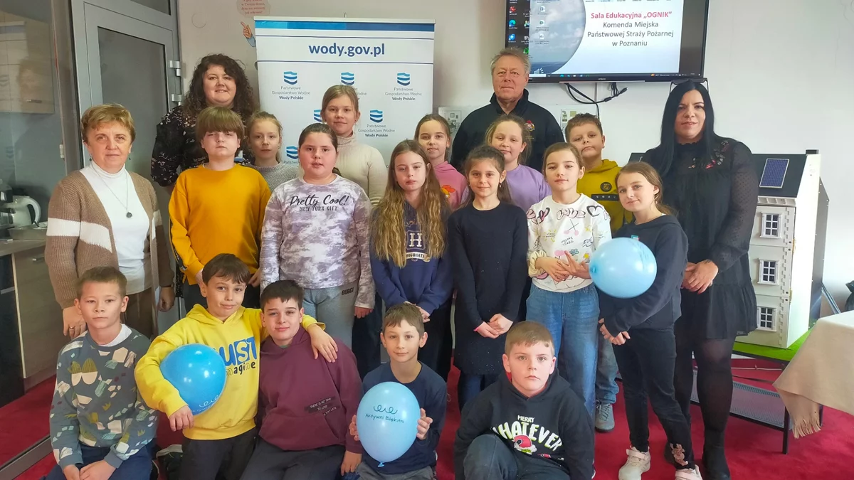 Następnie koordynatorki programu Aktywni Błękitni z RZGW w Poznaniu przeprowadziły prezentację i porozmawiały z dziećmi o wodzie, a także o konieczności racjonalnego korzystania z jej zasobów. Prelekcje na ten temat zakończyło wspólne rozwiązywanie wodnych łamigłówek, które sprawiło wiele radości. W drugiej części zajęć, dzieci poprzez zabawę uczyły się, jak unikać zagrożeń w swoim otoczeniu oraz jak podnieść poziom bezpieczeństwa swojego i swoich bliskich. Uczestnicy dowiedzieli się również, jak prawidłowo reagować w przypadku zagrożenia.