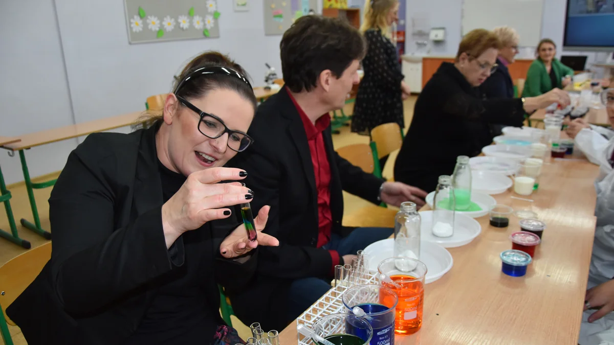 Po chwili goście znaleźli się w sali, która przekształciła się laboratorium chemiczno-przyrodnicze. Ósmoklasiści zaprosili ich do zajęcia miejsc w ławkach i... rozpoczęła się lekcja chemii, z najróżniejszymi doświadczeniami, do których wykorzystano nowe wyposażenie pracowni ekologicznej. Było ciekawie.