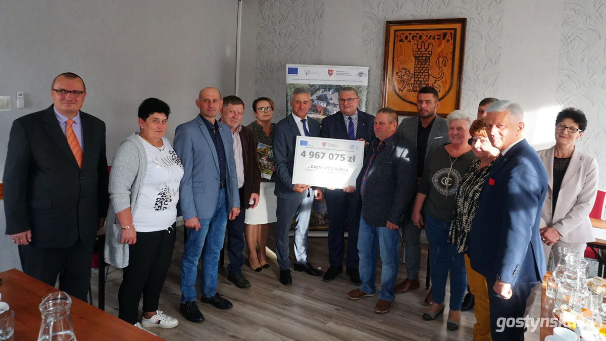 W niewielkiej sali Urzędu Miejskiego w Pogorzeli w środę, 11 października 2023 r. doszło do podpisania umów i symbolicznego przekazania dotacji z Europejskiego Funduszu Rolnego na rzecz Obszarów Wiejskich z programu na lata 2014- 2020 na wybudowanie kanalizacji sanitarnej w Gumienicach.